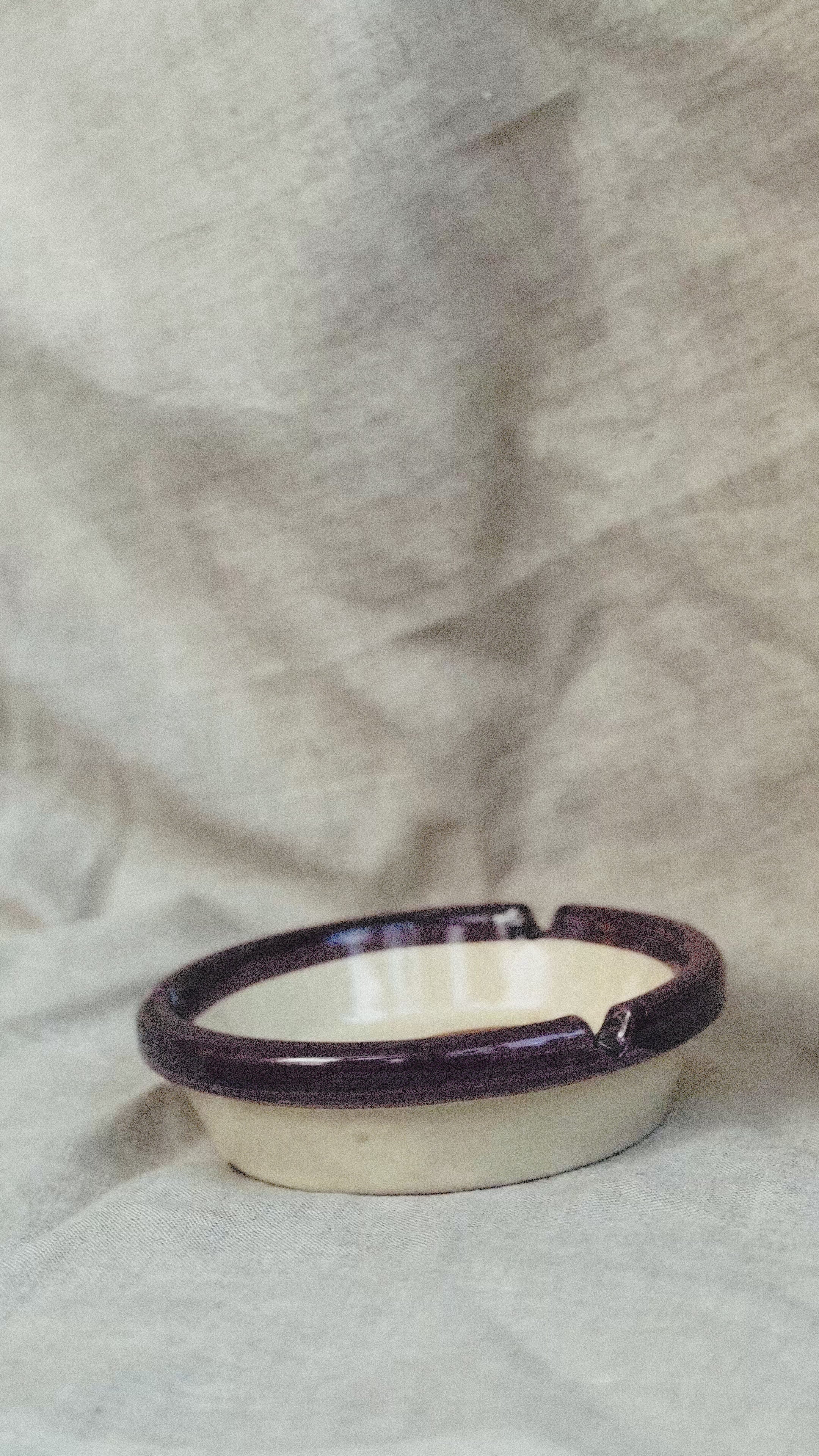 This Portuguese ceramic ashtray is a small piece of authenticity. Produced by Faianças de Vila Fresca (FVF) in Azeitão and signed by Quina, this 1970s piece fuses utility with artisanal charm. At its center, a hand-painted partridge rendered with vivid detail and personality, framed by a deep burgundy glazed rim that adds bold contrast. The delicate surface crazing tells a quiet story of time and use.