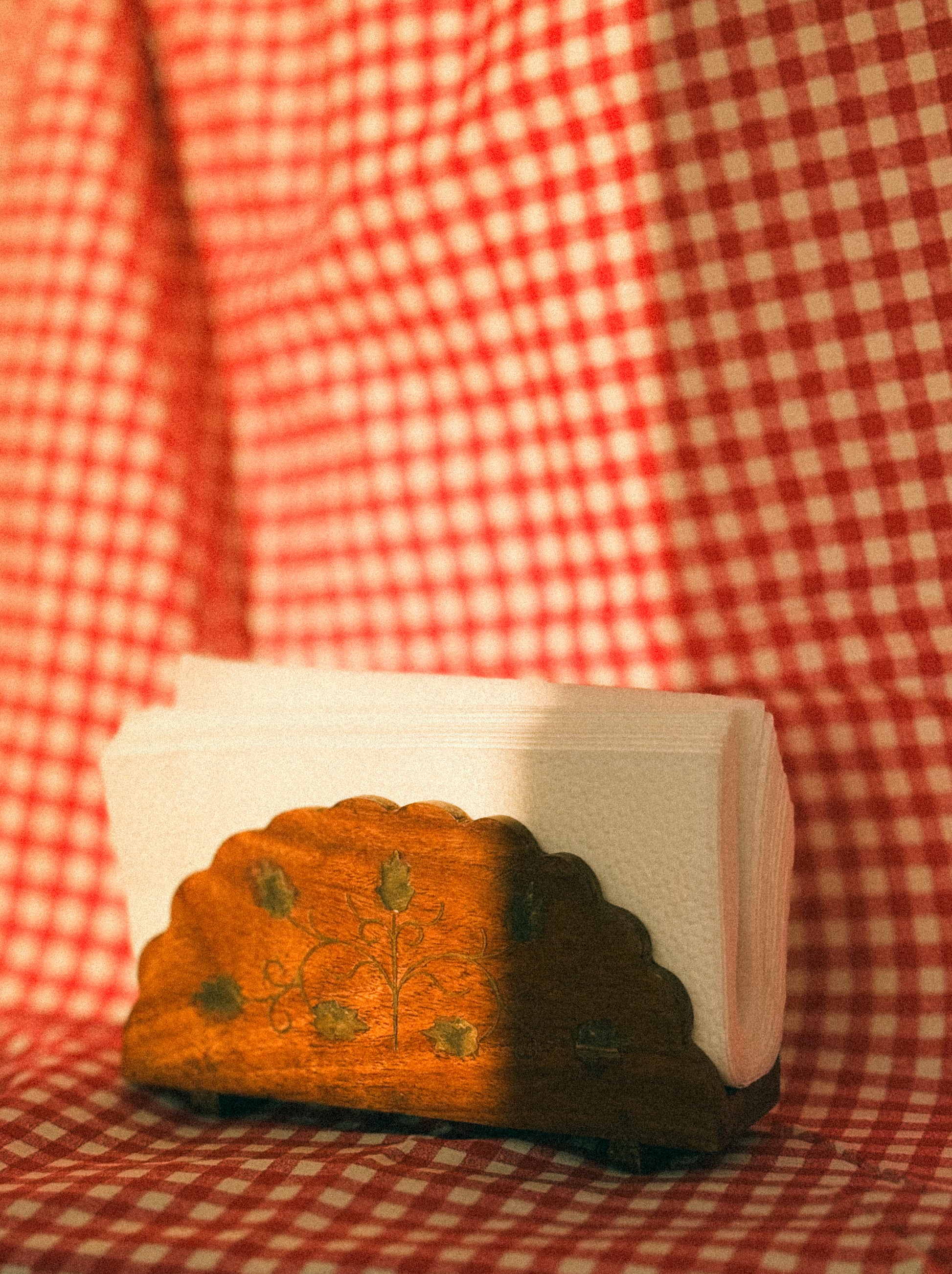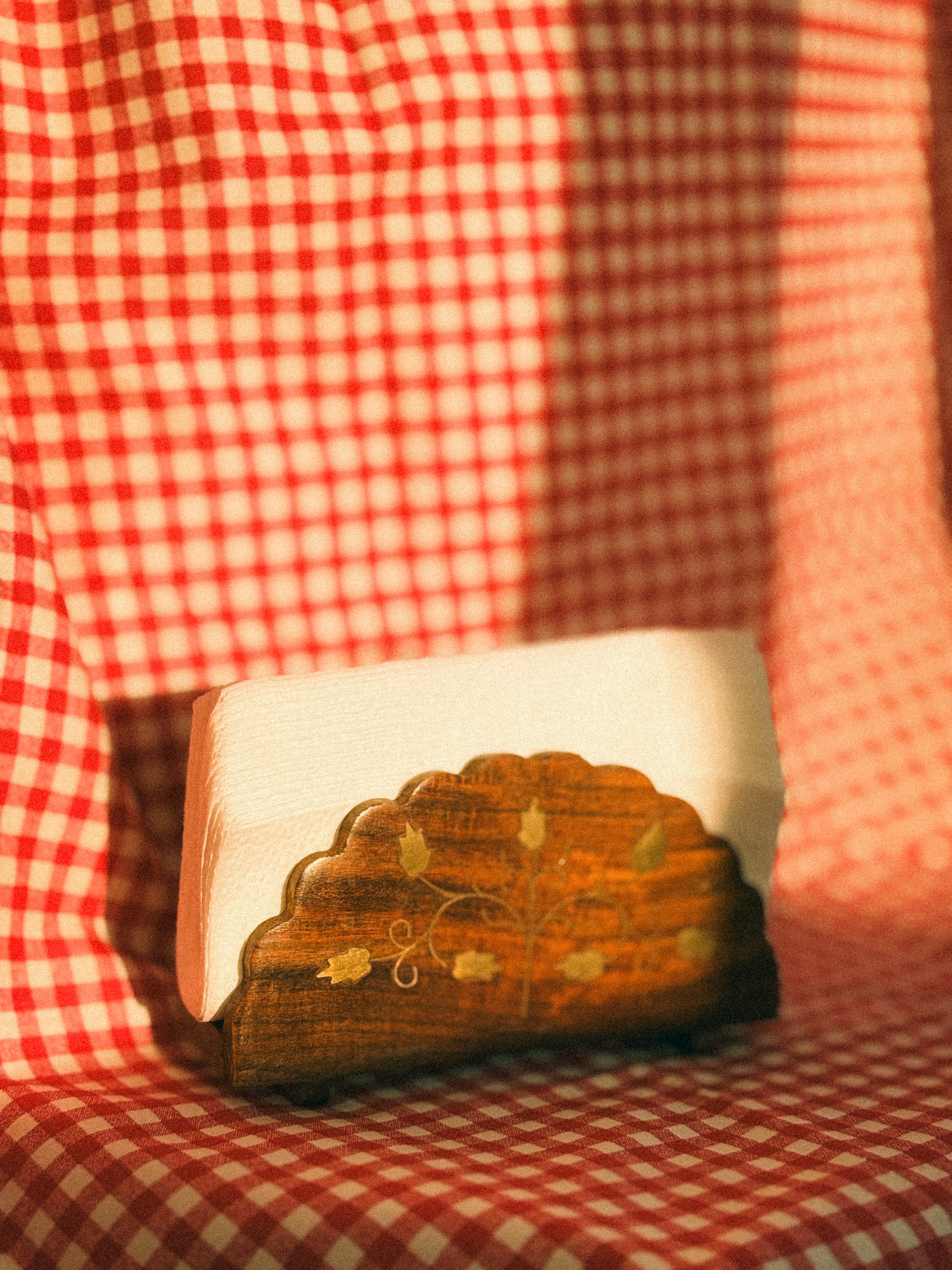 Este porta-guardanapos, esculpido em madeira escura e possivelmente recorrendo à técnica Tarkashi - uma técnica com centenas de anos com as suas origens no artesanato da Índia, é uma pequena peça de arte que evoca o encanto das mesas de jantar mais acolhedoras. A sua silhueta recortada em forma de concha adiciona um toque de fantasia, enquanto as intrincadas incrustações em latão formam um ramo floral delicado, com folhas e espirais que brilham com um reflexo dourado. Feita à mão com uma atenção notável aos detalhes, esta peça traz consigo uma história de paciência e tradição artesanal. É o acessório perfeito para dar um toque de calor e autenticidade à sua mesa, seja num piquenique de xadrez vermelho e branco ou numa refeição mais formal. Uma verdadeira celebração do ofício manual e do design atemporal.