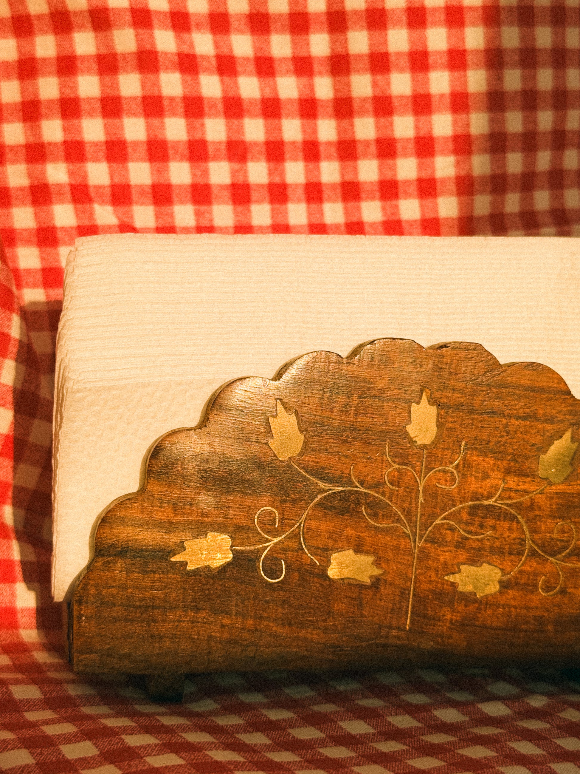 Porta-guardanapos de Madeira Esculpida com Incrustações de Latão